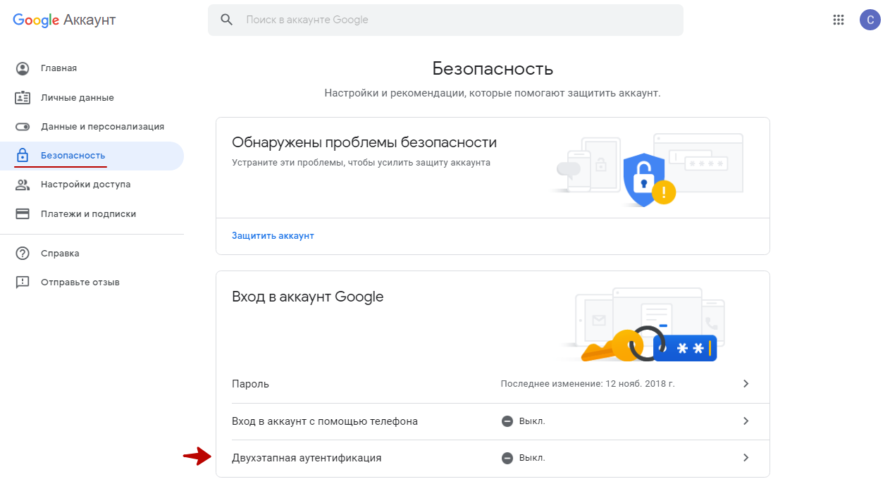 2) Перейдите в раздел «Безопасность» и включите двухэтапную аутентификацию (нужно выбрать дополнительный канал для получения одноразовых паролей: SMS, звонок, приложение от Google и т.п.).