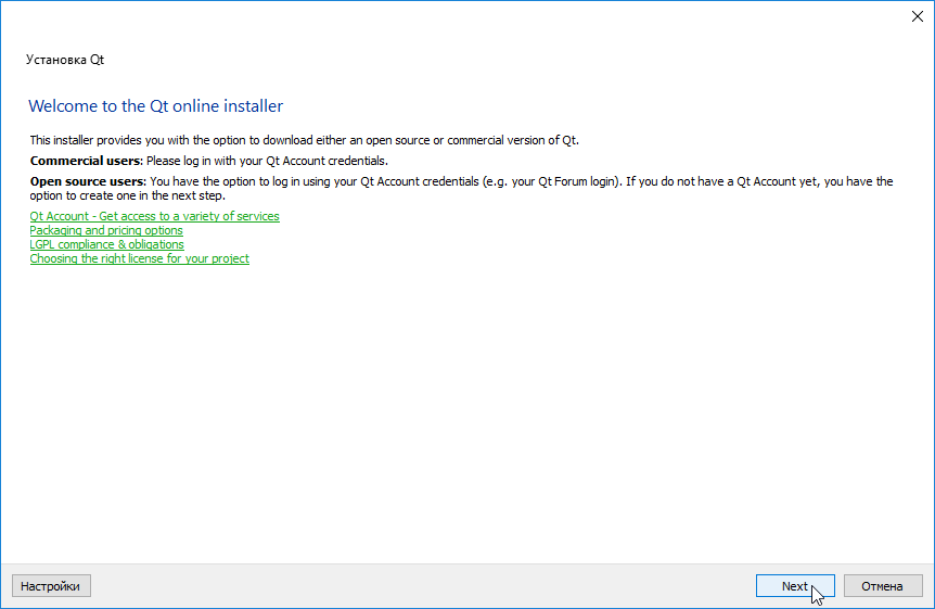 Перед вами окно приветствия онлайн-установщика Qt. Здесь вы можете ознакомиться с условиями использования Qt, узнать какую лучше выбрать лицензию для вашей программы на Qt, а также ознакомиться с информацией по дополнительным платным услугам и возможностях аккаунта Qt. Если вам это не интересно, сразу жмите кнопку Next.