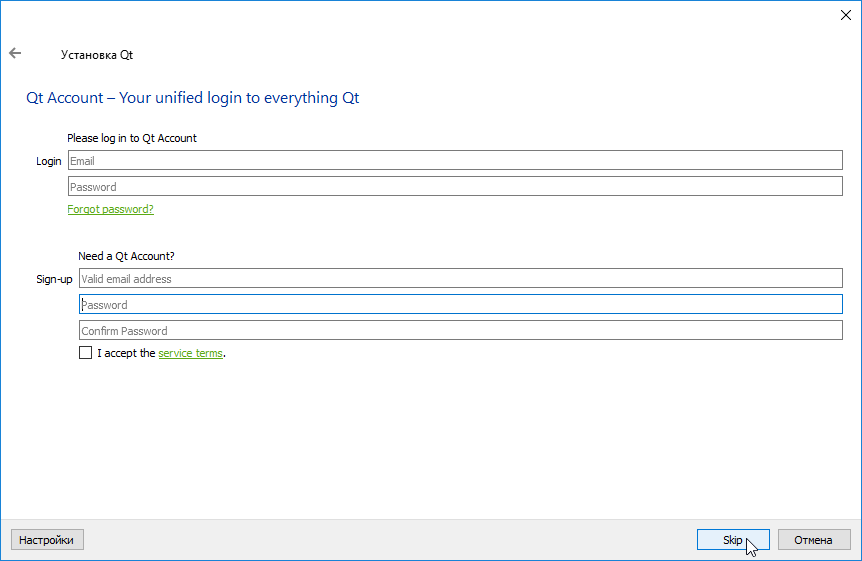 Вы также можете пропустить (Skip) этот шаг сейчас, а затем при необходимости можете сделать это самостоятельно, зайдя на страницу Qt-форума. При попытке войти на него вас попросят ввести данные аккаунта или зарегистрироваться (кнопка Sign in). К тому же вы можете воспользоваться этой ссылкой для регистрации нового аккаунта.