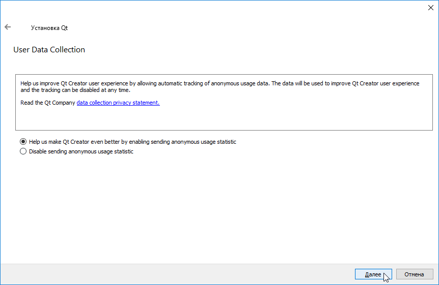 Теперь Qt Installer запрашивает ваше разрешение на сбор анонимной статистики для улучшения работы Qt в следующих версиях. Я выбираю опцию Help us make Qt Creator even better, потому как заинтересован в улучшении данного инструмента разработки и жму кнопку Далее.
