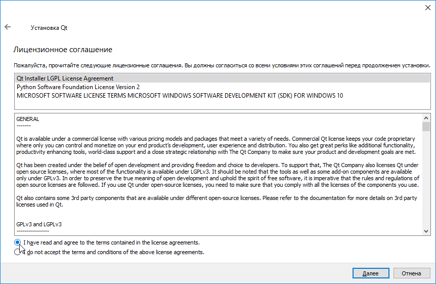 Итак осталось подтвердить ваше согласие с лицензией Qt (отметьте галочку I have read) и начать процесс установки (жмём кнопки Далее, Далее, Установить). Процесс установки может занять около 10 — 15 минут, так что это повод отвлечься от компьютера и заняться чем-нибудь более полезным. Например, помечтать о светлом будущем или обнять любимого человека.