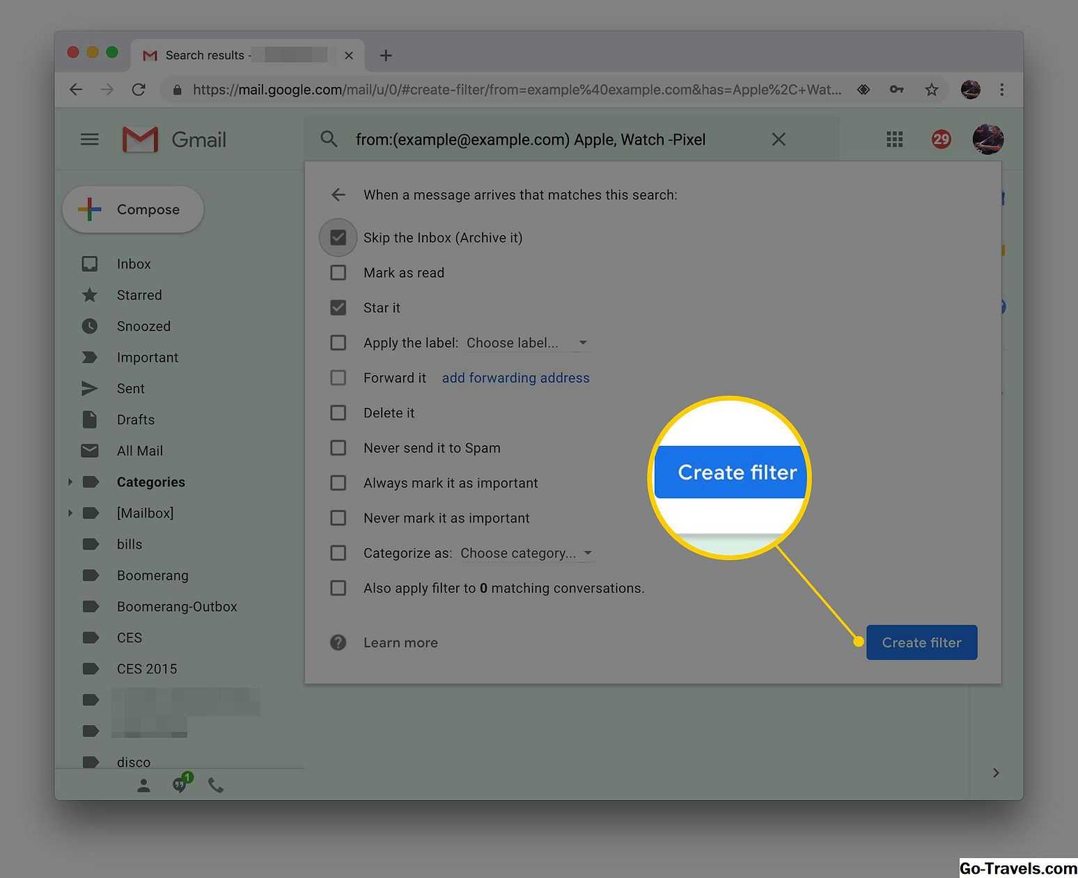 - После того, как вы нажали Создать фильтр появится экран с несколькими опциями, каждый из которых будет сопровождаться флажком, в том числе: Пропустить папку «Входящие» (сохранить ее), пометить, как прочитанное, Звезда это а также Удали это, среди прочих. Поместите галочку рядом с теми, которые указывают поведение, которое вы хотите применить к этому правилу. Например, вы можете автоматически архивировать сообщения, соответствующие вашим заданным критериям, гарантируя, что они никогда не приземляются в вашем почтовом ящике.