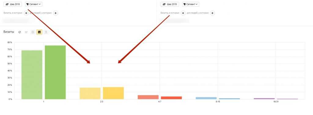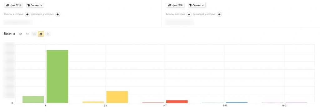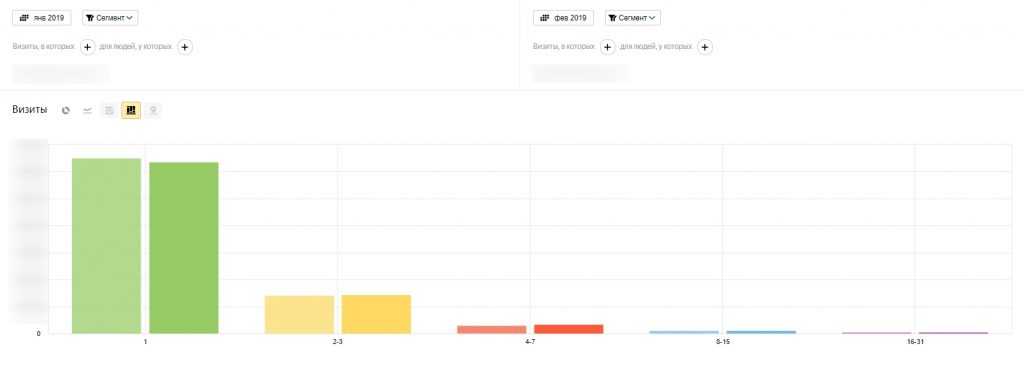Основная доля — те, которые были на сайте один раз. Но при этом есть и те, которые возвращались более 10 раз. Давайте сравним эти данные с информацией за прошлый месяц.