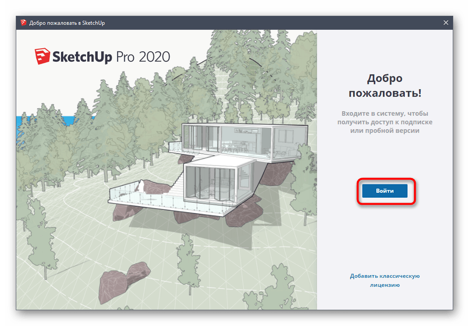 - После установки и запуска SketchUp нужно нажать по кнопке «Войти», чтобы подключить учетную запись пользователя. Если вы начали знакомство с пробным периодом, то с этого момента начинается отсчет дней до его завершения.