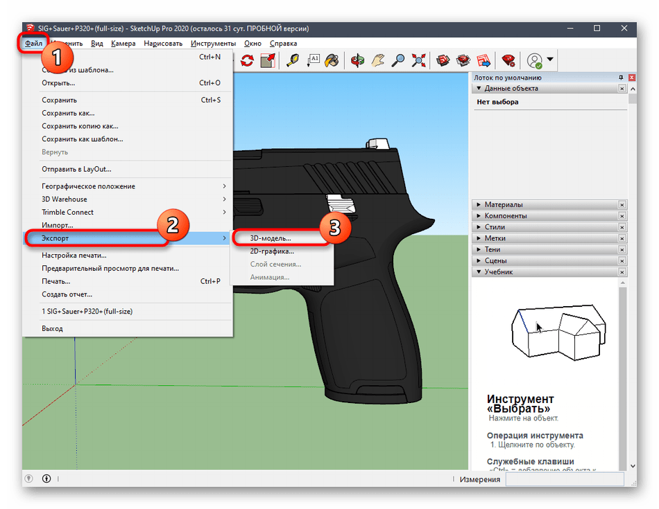 - Наведите курсор на раздел «Файл» — «Экспорт» и выберите «3D-модель».