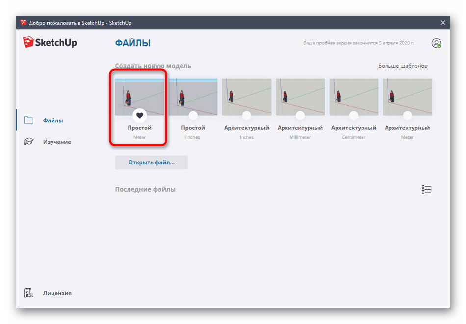 При появлении окна «Добро пожаловать в SketchUp» нажмите на «Простой», чтобы перейти к рабочему пространству.