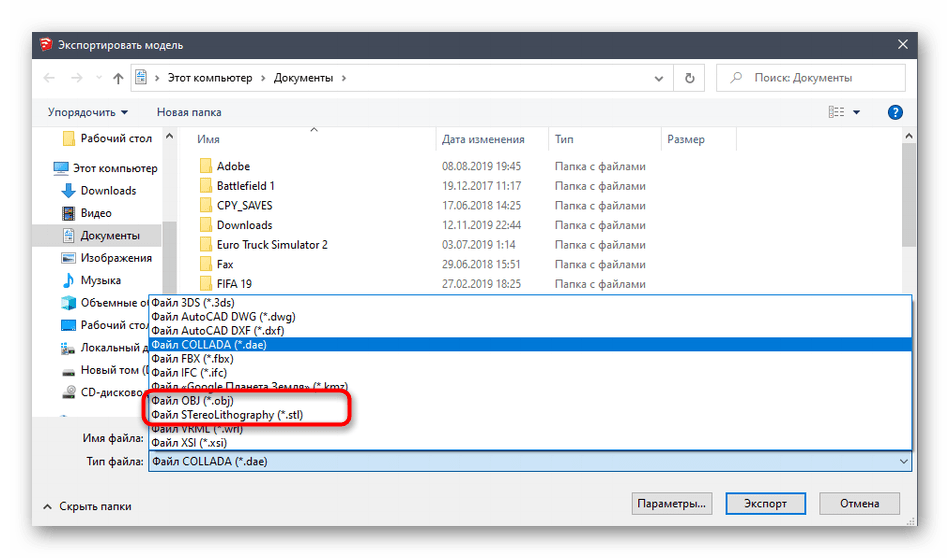 В появившемся окне Проводника вас интересует формат OBJ или STL.