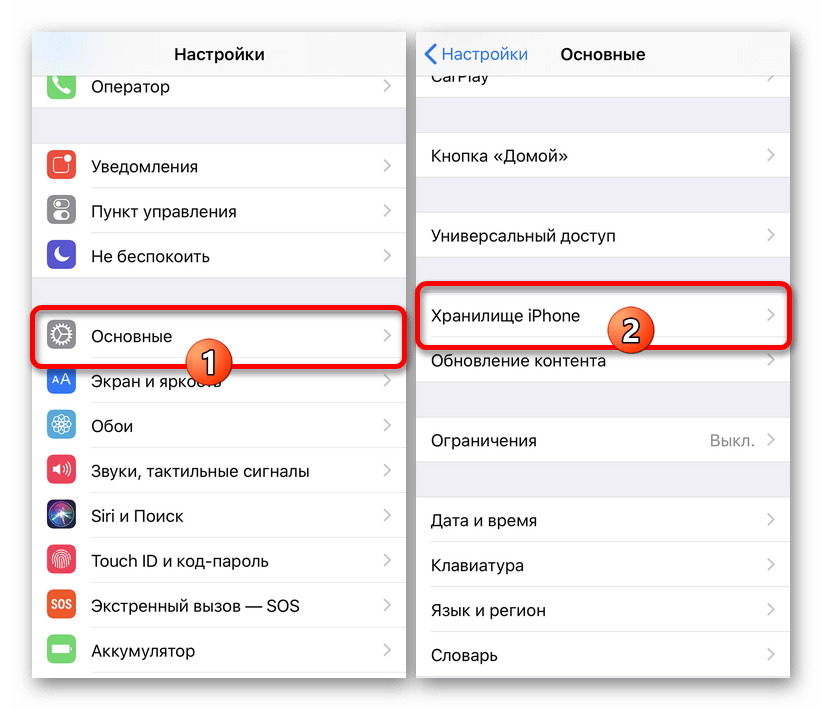 - На платформе iOS первым делом необходимо перейти в «Настройки» и открыть «Основные». Среди представленных разделов выберите «Хранилище iPhone».