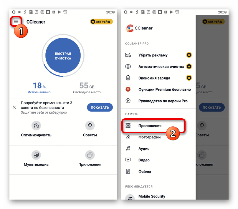- В качестве примера нами будет использоваться весьма популярная программа CCleaner. Для того чтобы начать удаление Яндекс.Почты с помощью указанного ПО, разверните главное меню и выберите раздел «Приложения».