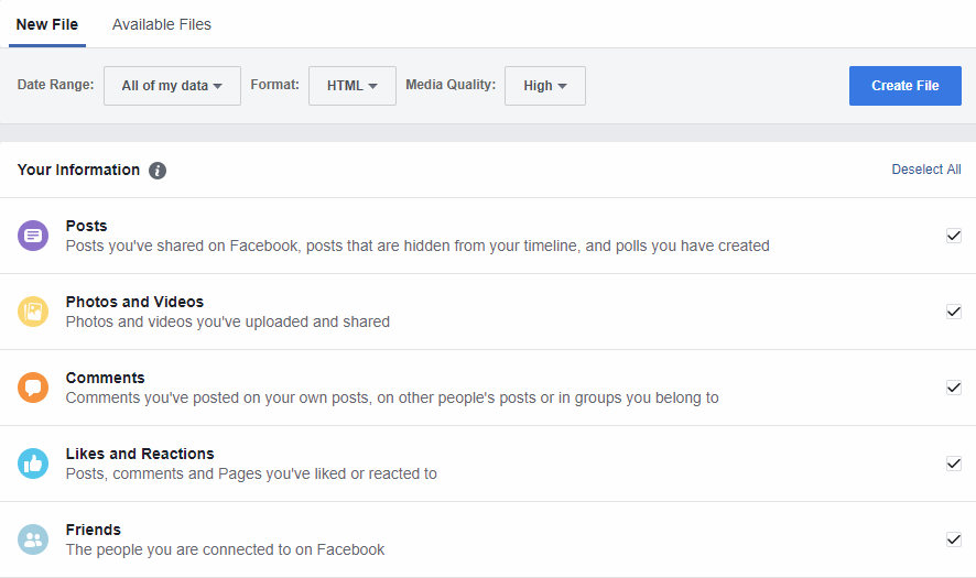 Как уже говорилось ранее, функция архива Facebook очень гибко настраиваема. Вы можете либо загрузить один тип контента, например, фотографии, либо выбрать полную резервную копию — выбор за вами.