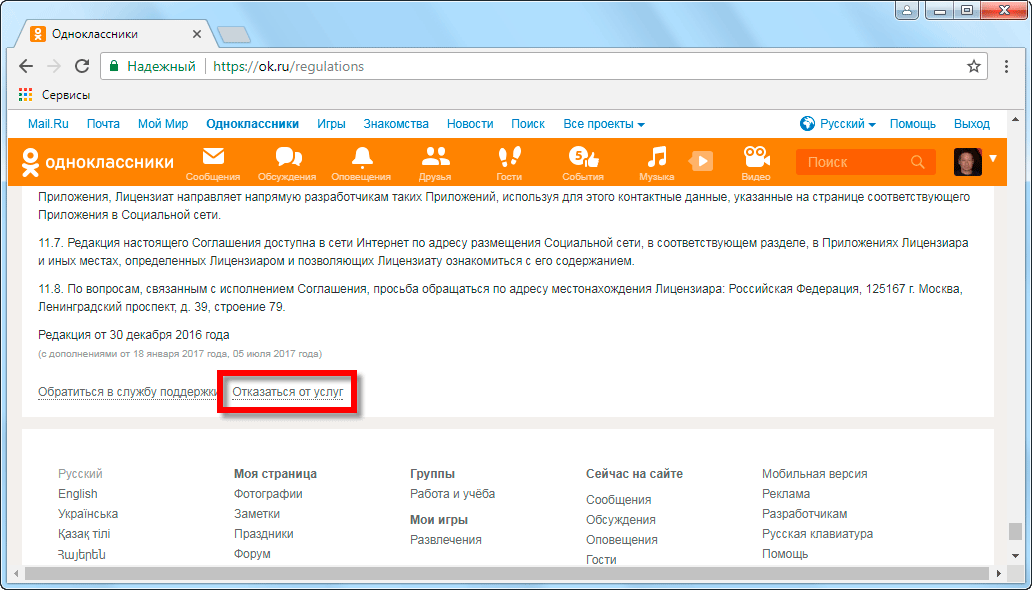 - На новой страничке представлены правила и условия использования социальной сети Одноклассники. Но наша задача не изучать их, а, наоборот, отказаться. Для этого прокручиваем текст вниз и кликаем по обозначенному на скриншоте пункту.