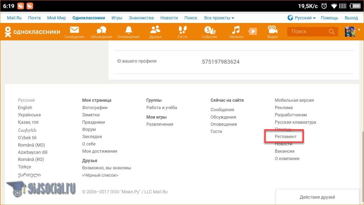 Итак, для начала необходимо зайти на Одноклассники. Это не обязательно должна быть главная страница профиля — подойдет и любая страница этой социальной сети. Проведите колесиком мышки до конца страницы. Снизу странички расположены столбцы с названиями разделов, представленных на сайте. Они значительно упрощают поиск нужной информации на Одноклассниках. Среди этих разделов необходимо найти слово Регламент и нажать на него левой кнопкой мышки.