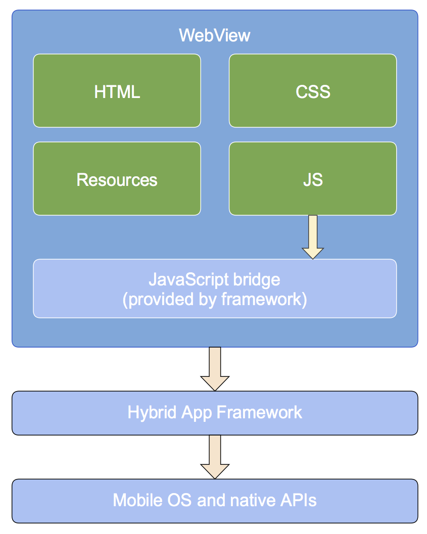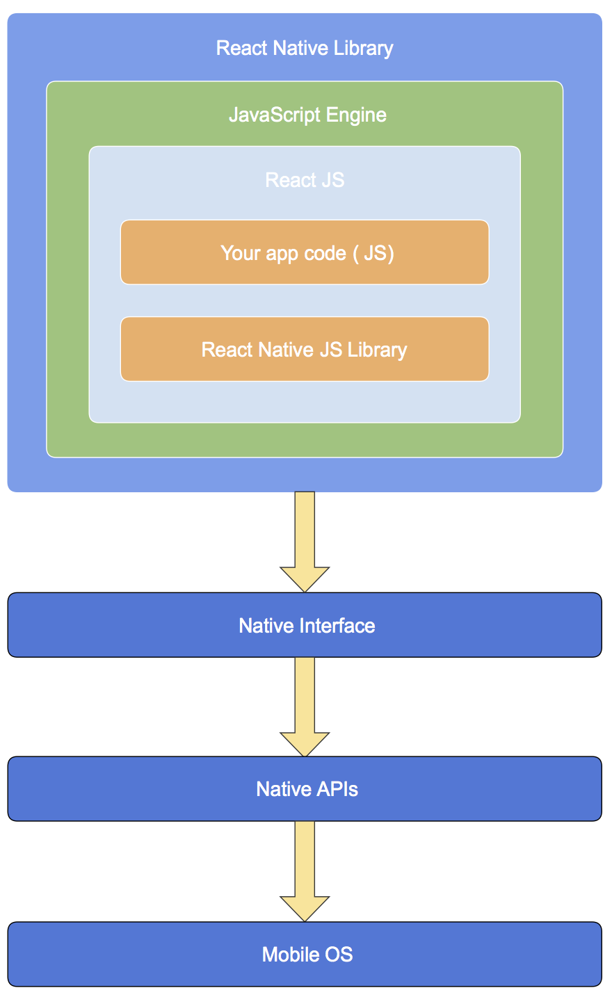 Схема показывает составляющие кода приложения и вызов нативного API из приложений. В случае Ionic 2 отрисовку интерфейса пользователя выполняет браузер, в для React Native — непосредственно операционная система. Такое различие проявляется в более привычной прорисовке компонент и более гладкой анимаций приложений на React Native. Пользовательский интерфейс React Native приложений будет ближе к другим приложениям платформы. Ввиду того, что приложение, написанное на React Native, компилируется в нативный для платформы язык, не нужно использовать дополнительные промежуточные компоненты (например, Cordova), часто это дает лучшую производительность приложений. Проблемы с производительностью — одна из проблем Ionic 2.