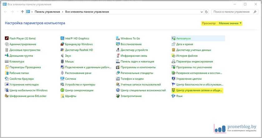 Для этого следуем в «Панель управления» и находим там вкладку «Центр управления сетями и общим доступом. Чтобы сделать это быстро, выберите режим просмотра «Мелкие значки»: