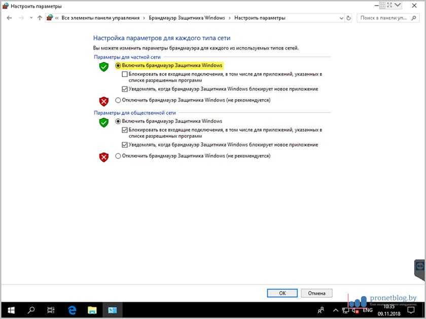 Если же это не так, открываем раздел «Включение и отключение брандмауэра Windows» и исправляем ситуацию, то есть включаем его: