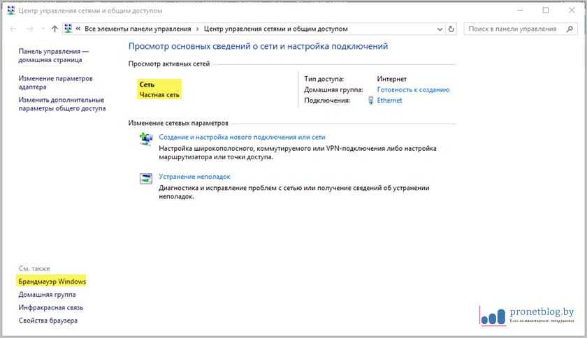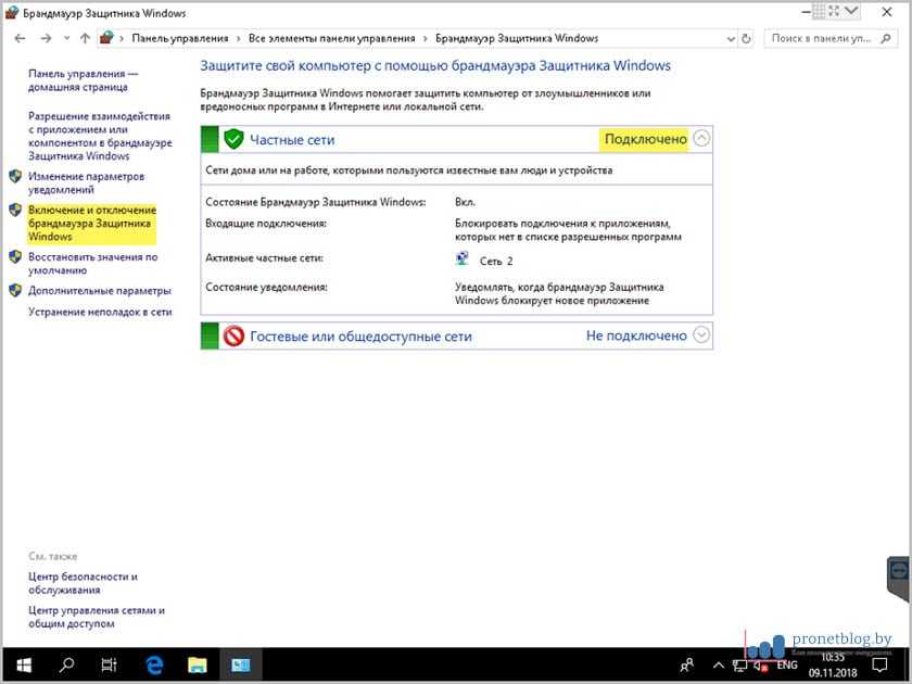 Поэтому теперь в нижней части жмем на пункт «Брандмауэр Windows» и смотрим на его состояние. На картинке ниже все хорошо, можно увидеть, что частная сеть подключена: