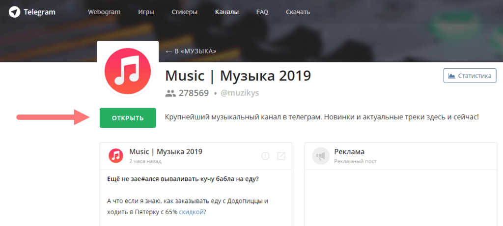 Например, вы выбрали канал, которым заинтересовались. Нажмите по кнопке «Открыть». При использовании Google Chrome откроется всплывающее окно, где нужно нажать кнопку «Открыть приложение Telegram Desktop» и ссылка откроется в программе.