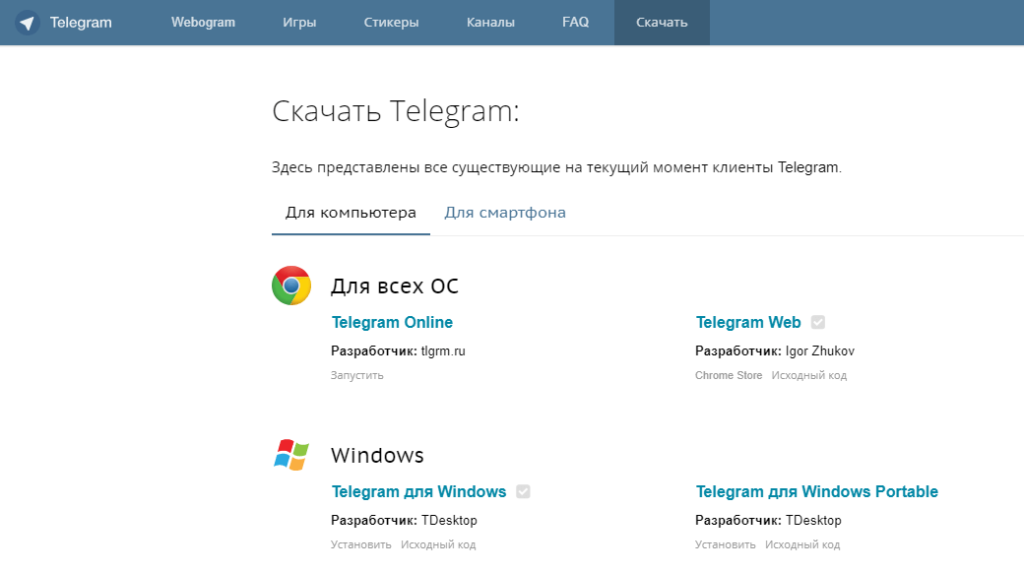 На сайте имеется вкладка «Для смартфона», где Telegram поддерживает следующие ОС: iOS, Android, Windows Phone, BlackBerry. Но об этих приложениях поговорим чуть позже.
