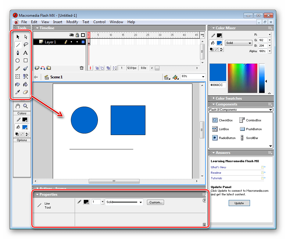 Здесь мы имеем дело не с обычным графическим редактором, а с программой, которая предназначена для создания веб-анимации. Разработчиком является известная многим компания Adobe, однако софт очень старый и давно не поддерживается. Присутствующих функций и инструментов вполне хватит, чтобы создать уникальную анимированную аватарку.