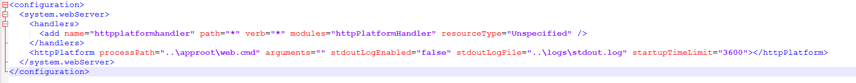 Обратите внимание на Web.config. Он ничего, кроме инструкции о передаче управления в «HTTP Platform Handler», по сути, не содержит: