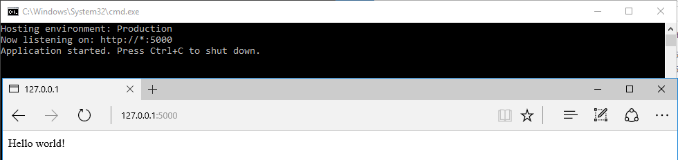В папке «src» лежат исходники нашего приложения. В «runtimes» лежит наш DNX, а в «packages» лежат доп. библиотеки, которые нужны для работы нашего решения. Иными словами, при публикации Visual Studio генерит папку, в которой находится все необходимое для запуска веб приложения. И если не стоит задача проксировать запросы через IIS, то просто запустив файлик «web.cmd», мы получим наше приложение, запущенное по порту 5000: