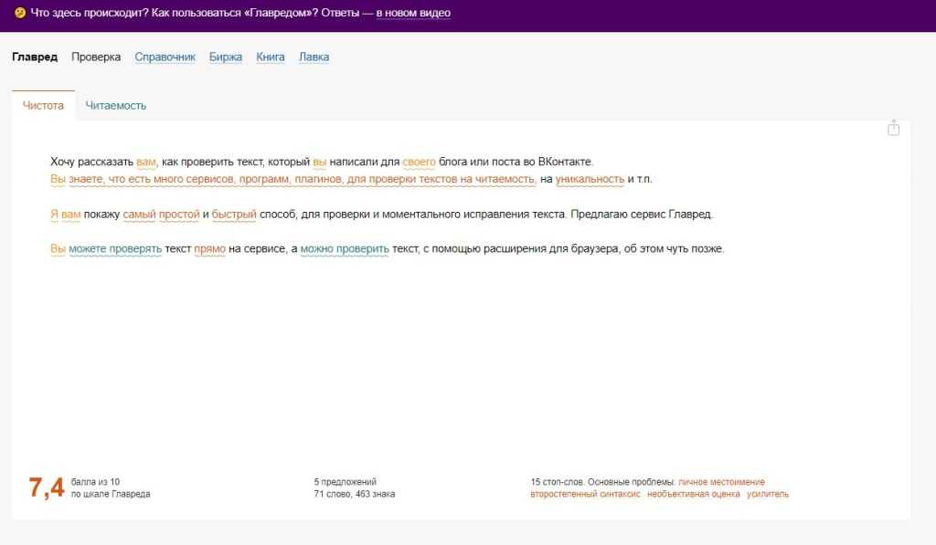 Помогает приблизить стиль текста к информационному и убрать весь словесный мусор. Сервис находит и выделяет «стоп-слова»: рекламные штампы, обобщения, канцеляризмы и слабые глаголы. Каждый текст получает оценку по 10-бальной шкале. Минимальный требуемый показатель нормального текста — от 7 баллов. Если меньше, дела плохи.