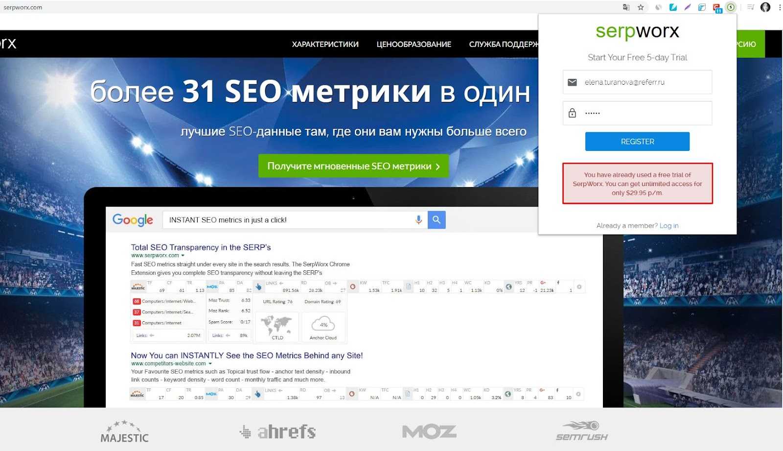 SerpWorx — если вы профессионал или владелец компании и не хотите тратить время на работу с несколькими сервисами, то это расширение гугл хром для вас: Moz Metrics, SEMrush, Ahrefs, Majestic SEO и др. Всего 30 SEO показателей в один клик. Для лучшей работы расширения необходимо подключить аккаунт Ahrefs.