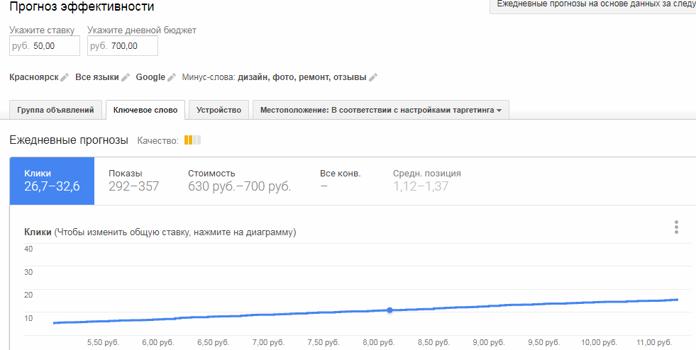 На появившейся странице указываете максимальную ставку для фраз и плановый дневной бюджет. После чего получите примерный прогноз по кликам и показам.