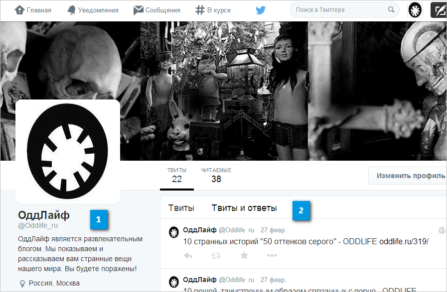 Ниже на изображениях отмечены элементы домашней страницы и страницы профиля в твиттер. Описание отмеченных элементов приведены под изображением.