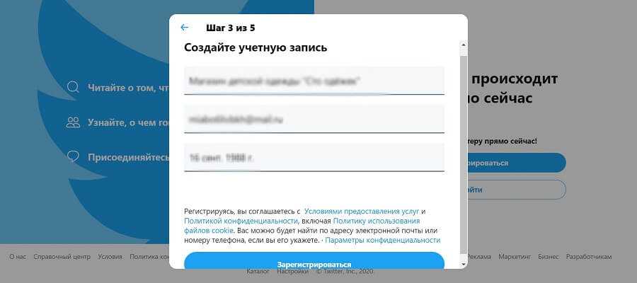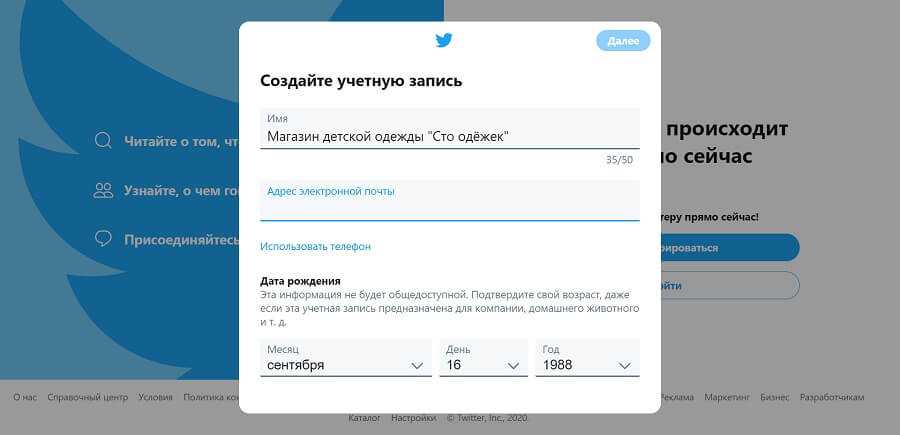 Твиттер при регистрации не разделяет аккаунты на коммерческие и личные, поэтому на старте вы попадаете на общую форму. При нажатии на кнопку «Зарегистрироваться» соцсеть предложит ввести имя, адрес почты или телефон, дату рождения (ее можно указать произвольно, но держитесь на всякий случай в рамках совершеннолетия, чтобы не попасть под ограничения).