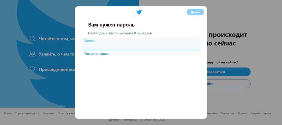 И только после подтверждения контактов Твиттер предлагает выбрать пароль.