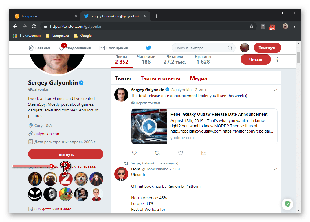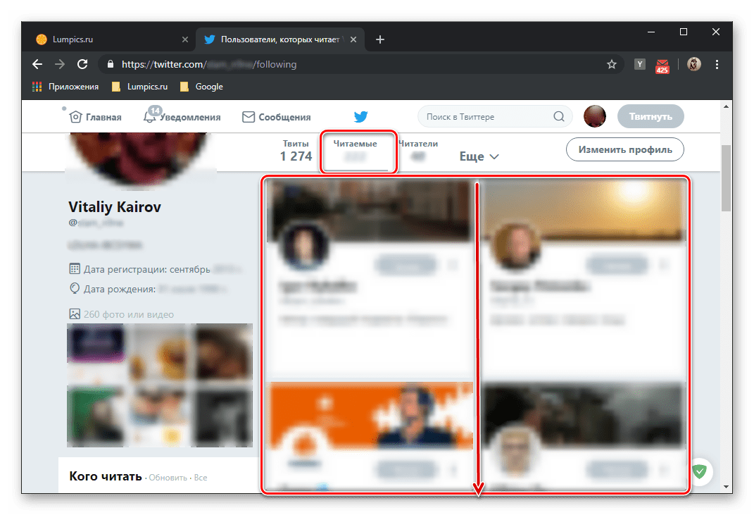 Если вы знаете, кому хотите написать, подписаны на него, но не знаете, как правильно пишется его имя или никнейм, перейдите на свою страницу, нажав по имени (справа от фото профиля), а затем откройте вкладку «Читаемые» и найдите там того человека, которому планируете отправить сообщение. Нажмите по его имени для перехода на соответствующую страницу.