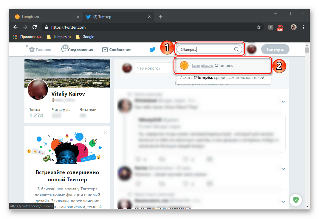 Также нам нужно подписаться хотя бы на нескольких людей, чтобы в нашей ленте появились твиты. Для этого предлагаю воспользоваться поиском введя фамилию или логин, если известно.
