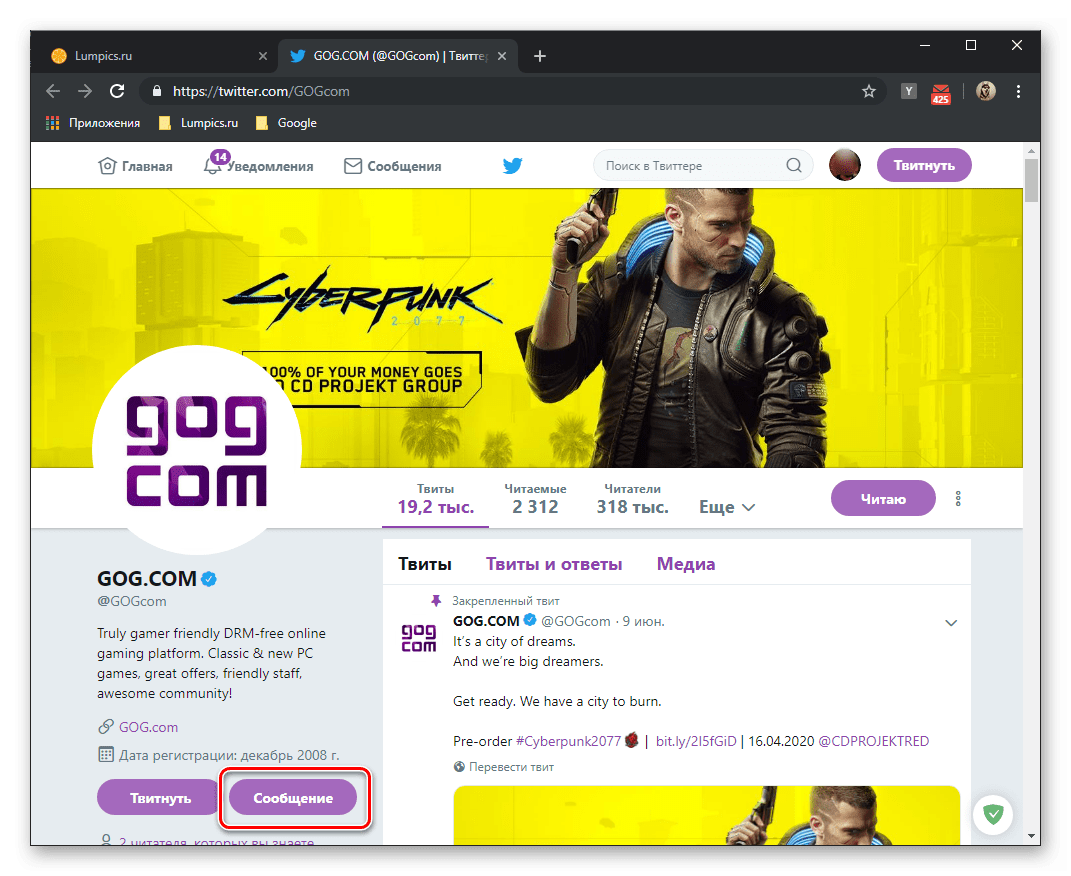 Вне зависимости от того, под управлением какой операционной системы работает ваш компьютер или ноутбук и каким браузером вы пользуетесь, для отправки сообщения пользователю соцсети Твиттер перейдите по представленной ниже ссылке и выполните следующие действия: