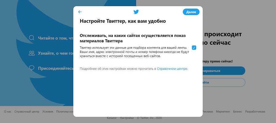 На следующем шаге Твиттер предложит согласиться на персонализированные рекомендации. Формулировка на этом экране довольно запутанная, но если кратко — соцсеть просит разрешения отслеживать посещаемые вами сайты и на основе этого составлять ленту рекомендаций и актуальных тегов. Подробнее про систему персонализации в справочнике Твиттера. Для корпоративного аккаунта это обычно неактуально, но выбирать вам.