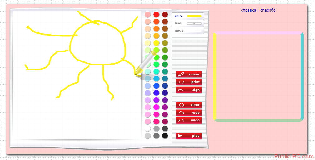 На панели – большая палитра цветов, также можно выбрать толщину фломастера. Рисунок можно подписать (Sign) или сразу распечатать (Print). Нажав кнопку Play пользователь увидит весь процесс создания рисунка.