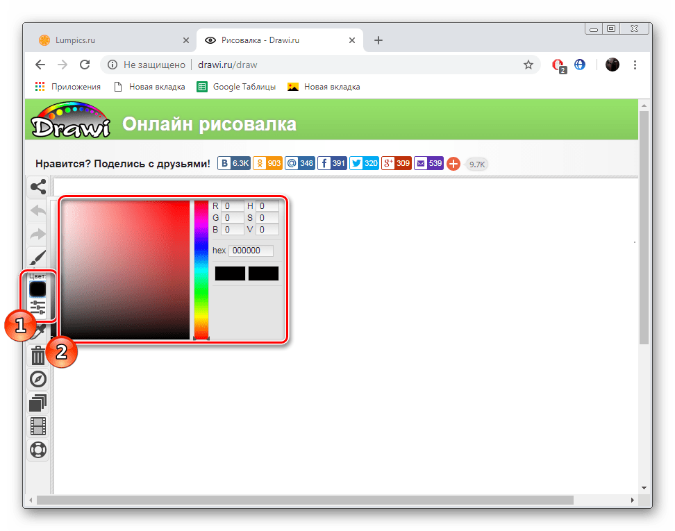 На панели слева находится квадрат с активным цветом, нажмите на него, чтобы отобразить всю палитру. Теперь вам доступен выбор цвета для рисования.