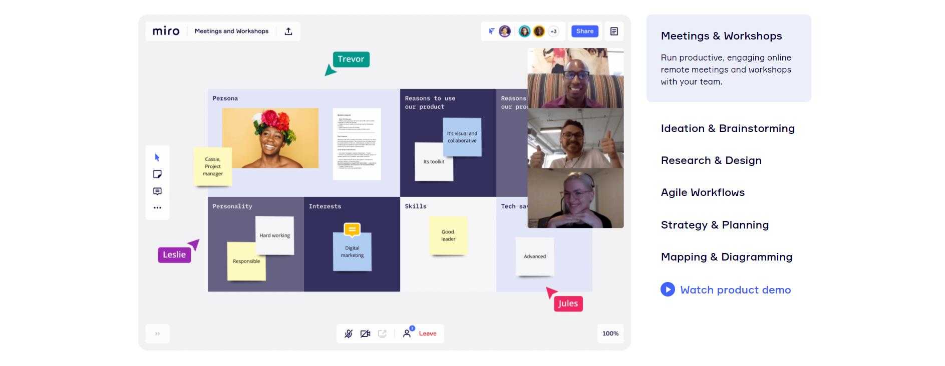 - Miro — онлайн-доски для регулярной работы команды, визуализации обсуждения на стикерах и в шаблонах, комплексных сессий, сбора библиотеки материалов.