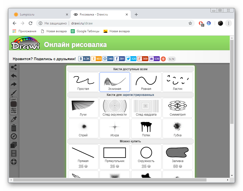 В нем вам позволяют выбрать один из типов кисти. Некоторые из них доступны только для зарегистрированных пользователей либо приобретаются отдельно за деньги или местную валюту сайта.