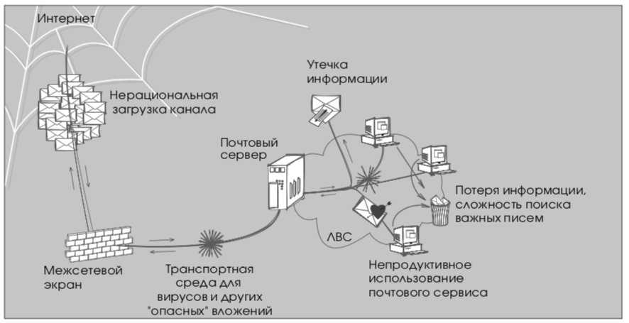 Электронная почта обладает многочисленными достоинствами, но именно из-за этих достоинств возникают основные риски, связанные с ее использованием. К примеру, доступность электронной почты превращается в недостаток, когда пользователи начинают применять почту для рассылки спама, легкость в использовании и бесконтрольность приводит к утечкам информации, возможность пересылки разных форматов документов – к распространению вирусов и т.д.