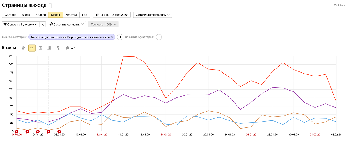 Отчет помогает отобрать группу страниц для анализа, с которых посетители чаще всего покидают сайт. Причины могут быть разные, например: нужно добавить дополнительные инфо-блоки для увеличения вовлеченности, увеличить количество способов оплаты, упростить форму с заявкой и так далее.