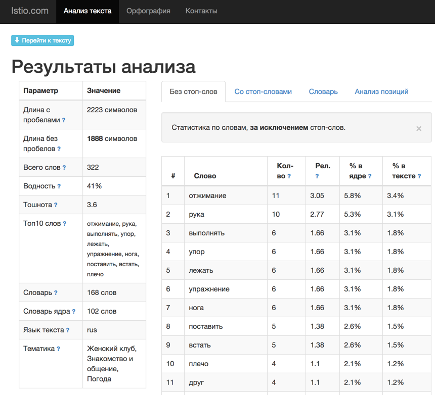 Чтобы найти закономерности между эффективным контентом на разных сайтах, можно использовать специальные анализаторы, которые выдают сводку по различным характеристикам исследуемого текста