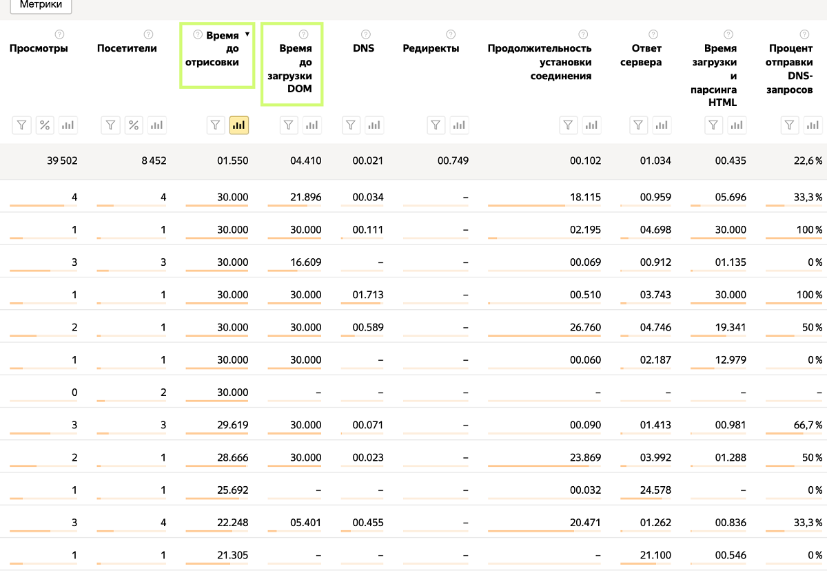 - Отбираем страницы с большим количеством посетителей и высоким временем до загрузки DOM/отрисовки;