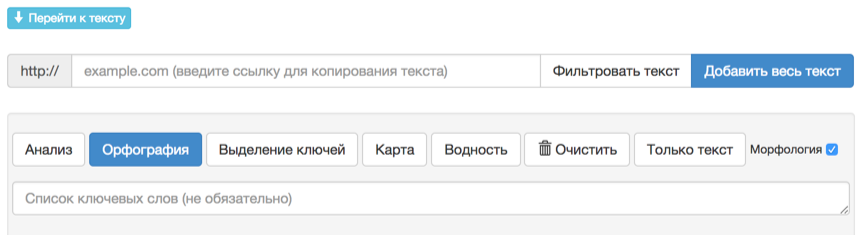 Ниже можно переключаться между вкладками с проверкой орфографии, картой с выделением наиболее популярных слов. Также здесь есть такая интересная возможность, как копирование текста с указанного URL с фильтрацией всего лишнего: