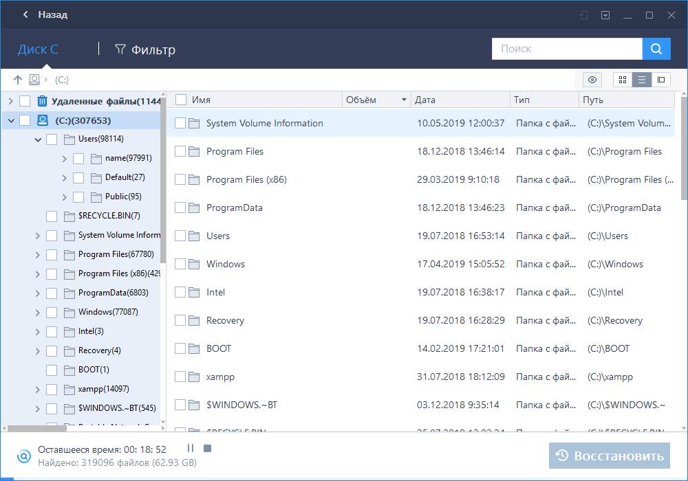 Wise Data Recovery – это бесплатная утилита, с помощью которой можно быстро и безопасно восстановить удаленные или отформатированные файлы. Предусмотрено два режима сканирования, а также предпросмотр данных, который были обнаружены. Для простой навигации есть фильтрация по определенным параметрам. Достаточно выбрать раздел диска и выбрать один из видов поиска. Программа работает с различными типами файлов: от документов и архивов до видео и аудио. В платной версии приложения реализована приоритетная техническая поддержка.