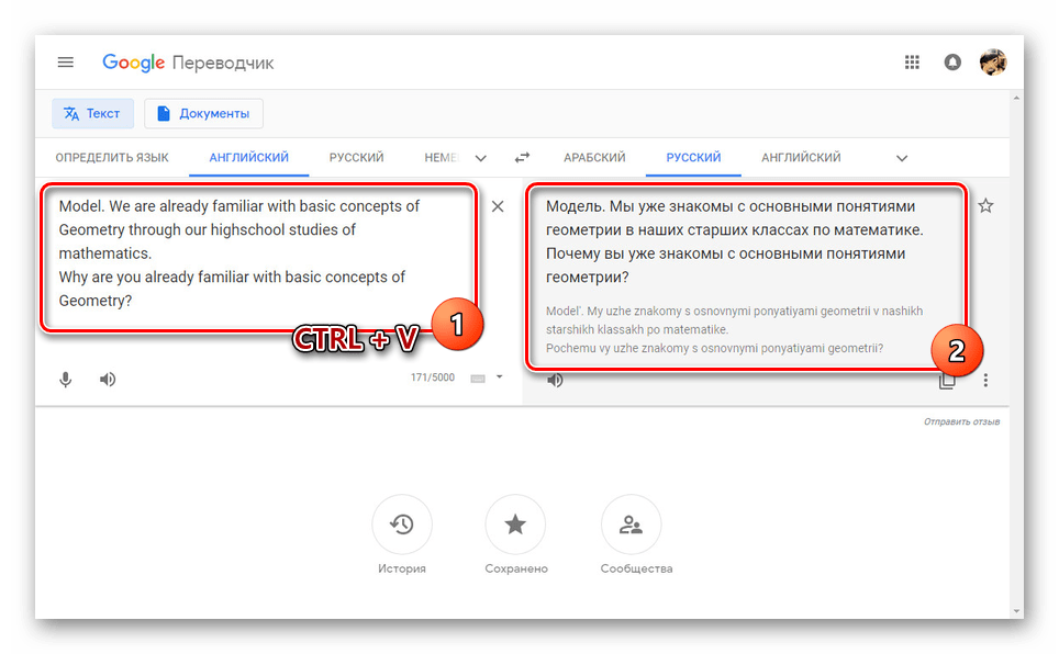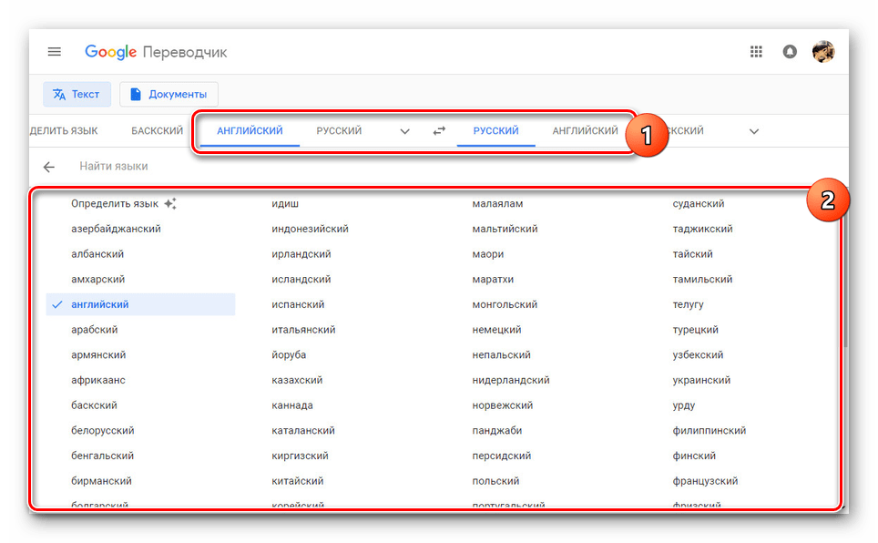 - Откройте Гугл Переводчик, используя ниже представленную ссылку, и на верхней панели выберите подходящие языки.