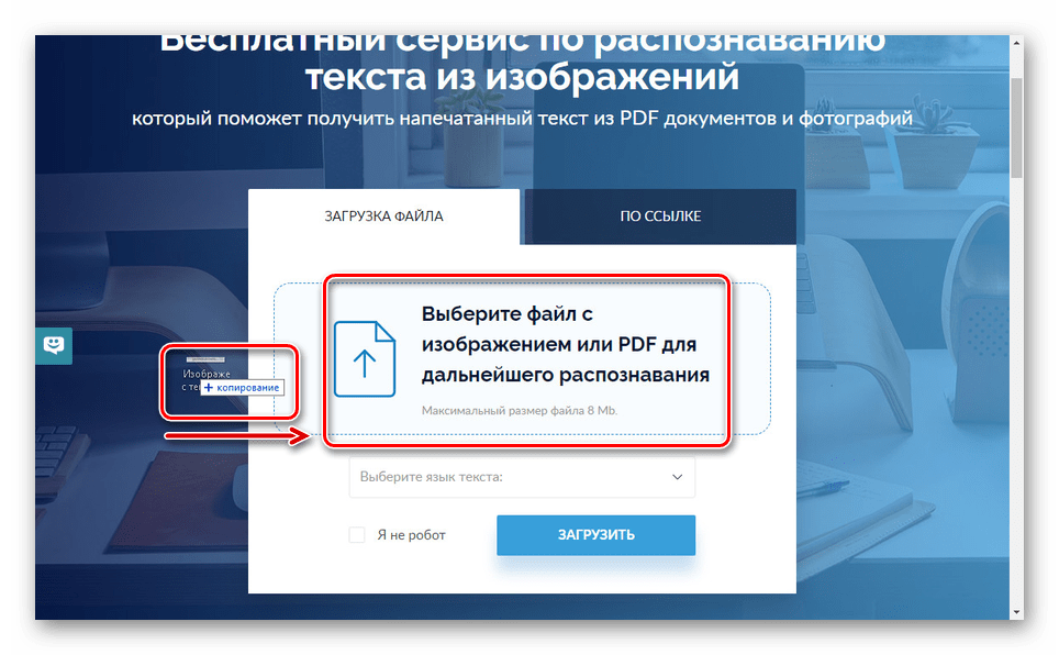 - находите файл на компьютере или перетаскиваете изображение в окошко онлайн переводчика.