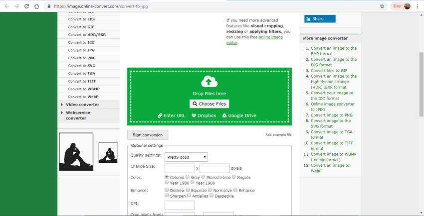 Online Convert — это бесплатный онлайн-конвертер видео в конвертер последовательностей изображений, который поддерживает широкий спектр форматов. С помощью программы вы можете добавить нужные видеофайлы с вашего ПК, Dropbox, Google Drive или через URL. Для расширенных настроек вы можете выбрать качество извлекаемых изображений, выбрать их размер и цвет. Есть также опции для улучшения изображений, обрезки пикселей, а также ввода DPI. Настройки, сделанные для извлечения изображений, также могут быть сохранены для будущего использования. Извлеченные картинки можно скачать из самого интерфейса программы.