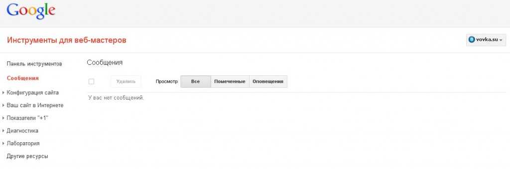 2. Проверьте наличие уведомлений от Google в Google Webmaster Tools с наличием сообщения о спамерской активности вашего ресурса. Для этого заходим на http://www.google.com/webmasters/, авторизуемся. Далее заходим в статистику своего сайта и переходим в раздел сообщения (кликабельно):