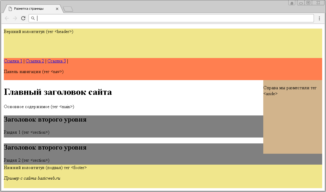 <!DOCTYPE html> <html> <head> <title>Разметка страницы</title> </head> <body> <header style = "background-color:khaki; height:100px"> <p>Верхний колонтитул (тег <header>)</p> </header> <nav style = "background-color:coral; height:75px"> <a href = "#">Ссылка 1</a> | <a href = "#">Ссылка 2</a> | <a href = "#">Ссылка 3</a> | <p>Панель навигации (тег <nav>)</p> </nav> <aside style = "float:right; width:200px; height:250px; background-color:tan"> <p>Справа мы разместили тег <aside></p> </aside> <main style = "height:250px"> <h1>Главный заголовок сайта</h1> <p>Основное содержимое (тег <main>)</p> <section style = "background-color:grey; height:75px"> <h2>Заголовок второго уровня</h2> <p>Раздел 1 (тег <section>)</p> </section> <section style = "background-color:grey; height:75px"> <h2>Заголовок второго уровня</h2> <p>Раздел 2 (тег <section>)</p> </section> </main> <footer style = "background-color:khaki; height:80px"> <p>Нижний колонтитул (подвал) тег <footer></p> <address>Пример с сайта basicweb.ru</address> </footer> </body> </html>